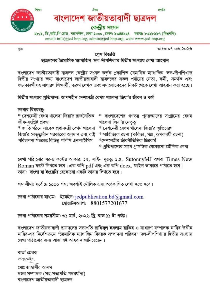 ছাত্রদল ছাত্রদলের ত্রৈমাসিক ম্যাগাজিন ‘দল-দীপশিখা’র দ্বিতীয় সংখ্যায় লেখা আহবান মার্চ 7, 2026 ট্যাগ: দল-দীপশিখা শেয়ার করুন লিঙ্ক কপি করা হয়েছে!