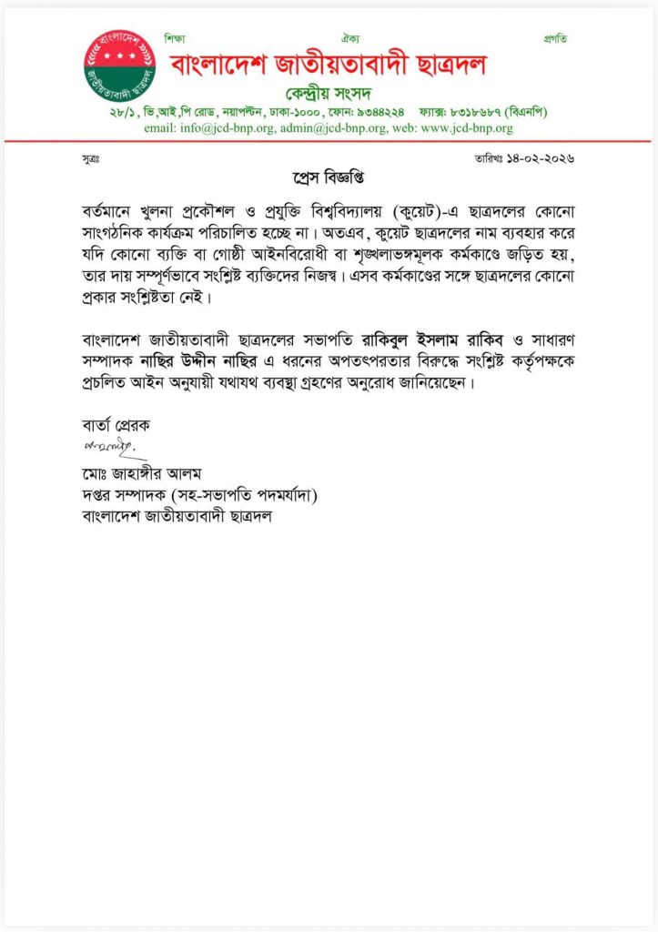 প্রেস বিজ্ঞপ্তি জরুরি প্রেস বিজ্ঞপ্তি (১৪-০২-২০২৬) ফেব্রুয়ারি 14, 2026 ট্যাগ: কুয়েটছাত্রদল শেয়ার করুন লিঙ্ক কপি করা হয়েছে!