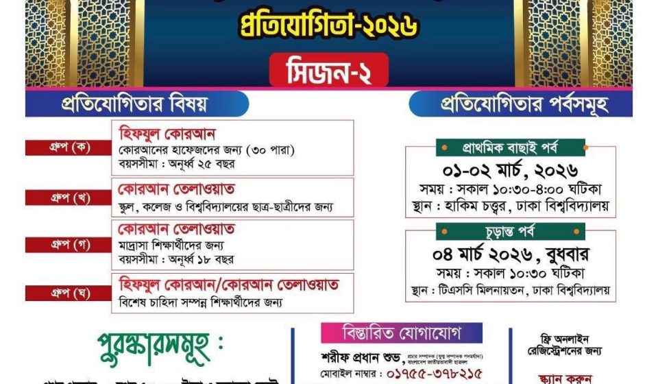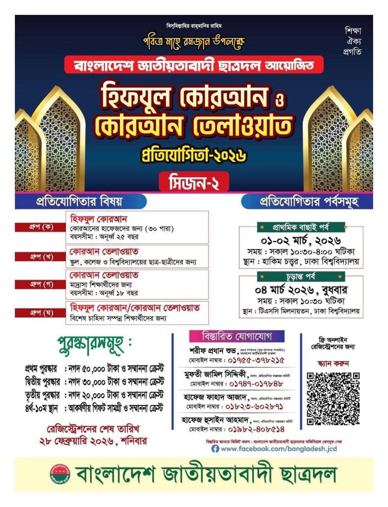 ছাত্রদলপ্রতিযোগিতা হিফযুল কোরআন ও কোরআন তেলাওয়াত প্রতিযোগিতা-২০২৬, সিজন-২ ফেব্রুয়ারি 25, 2026 বাংলাদেশ জাতীয়তাবাদী ছাত্রদল আয়োজিত “হিফযুল কোরআন ও কোরআন তেলাওয়াত প্রতিযোগিতা-২০২৬, সিজন-২” শেয়ার করুন লিঙ্ক কপি করা হয়েছে!